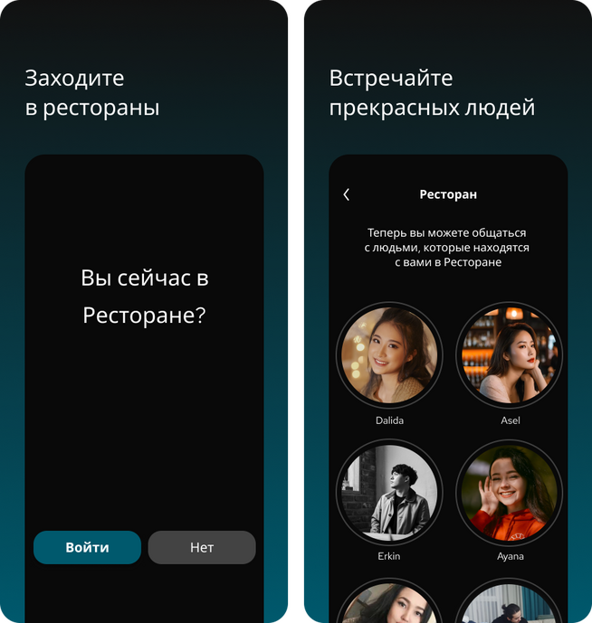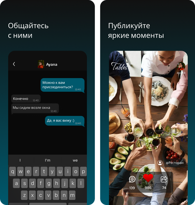 Находитесь в ресторане, в баре или в любом другом заведении? Теперь вы можете с легкостью написать понравившемуся вам человеку за соседним столиком - просто зайдите в заведение в нашем приложении. Да! Соцсети еще никогда не были такими настоящими!У вас есть шанс не просто лайкать, постить или комментировать – а заводить настоящие знакомства и общаться с теми, кого вы видите вживую.Делитесь яркими моментами, создайте свой уникальный профиль, находите новых друзей и оживите ваше общение! Tables – это больше, чем соцсеть. Это новая реальность, где общение в сети становится живым!